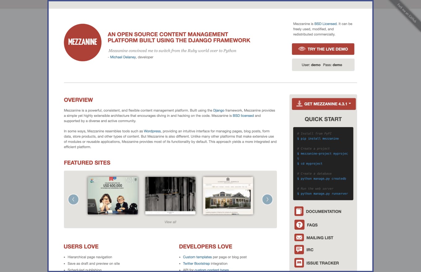 Mezzanine is a CMS created by Stephen McDonald in 2010. Similar to WordPress, it has most of its functionality by default, which makes it a more integrated and productive platform.