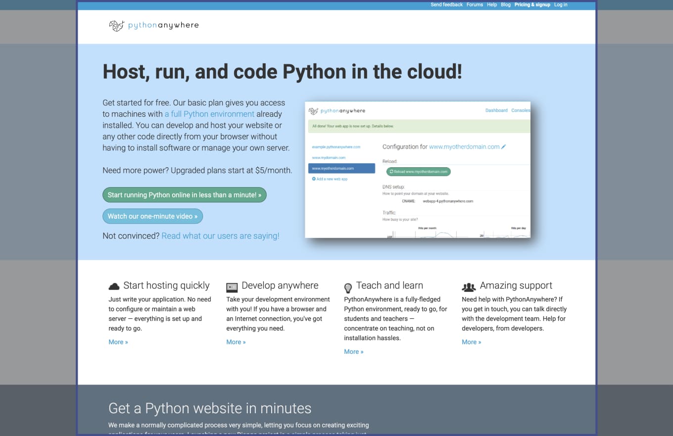 PythonAnywhere has a free plan with limited options, which is perfect to test the service and get you started as well as four paid plans. The prices vary from 5 to 100$, and there is a custom option where you can choose all of the features you need (5-500$ per month).
