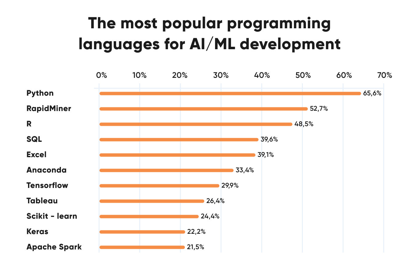 Python is broadly known as the king of programming languages when it comes to AI and ML. Statistics on developers’ preferences vividly show it.