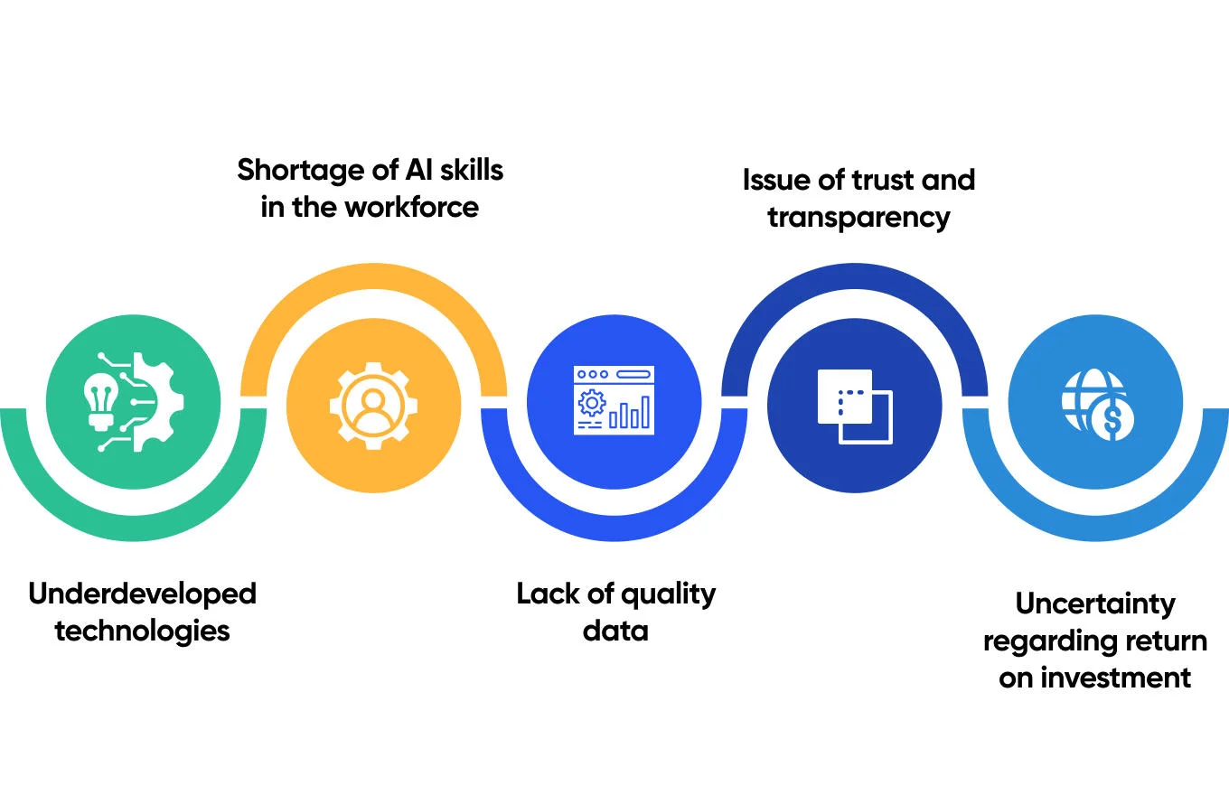 - Uncertainty regarding return on investment: Implementing AI technologies requires significant investments. You need to invest in infrastructure, software, and recruitment, but the return on investment (ROI) can be difficult to calculate. Moreover, it might be challenging to estimate the impact of AI on efficiency, cost savings, and scientific breakthroughs.