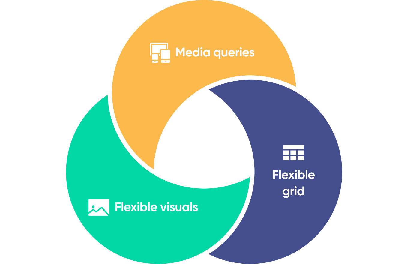 There are three main components of a responsive design: media queries, flexible visuals, and fluid grids. Let’s discuss them in detail.