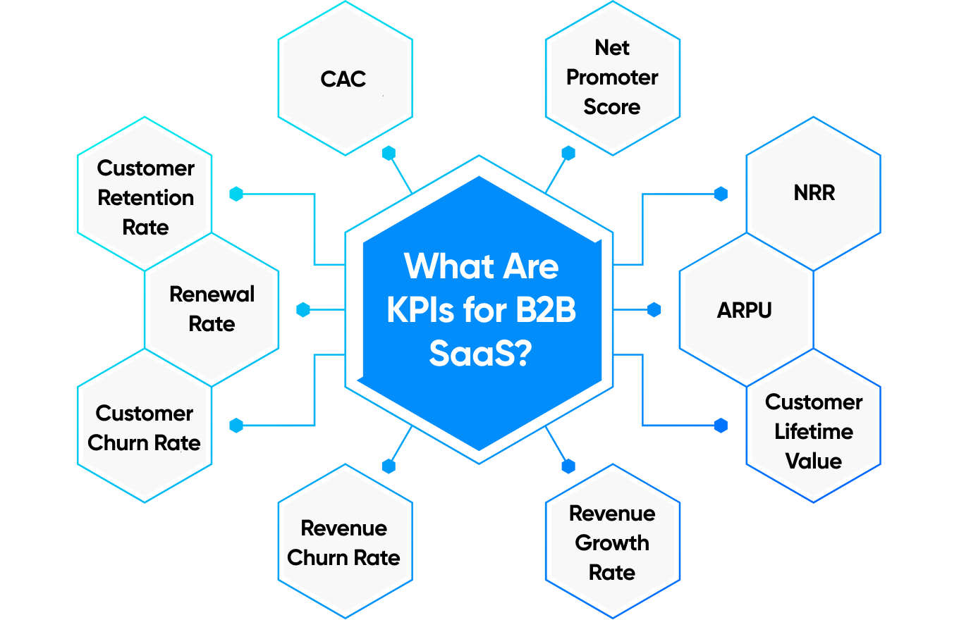 To measure their metrics properly, B2B SaaS companies should record the following parameters: customer retention rate, renewal rate, customer churn rate, revenue churn rate, customer lifetime value (CLV), existing customer revenue growth rate, the average revenue per user (ARPU), net revenue retention (NRR), customer acquisition cost (CAC) payback period, net promoter score (NPS).