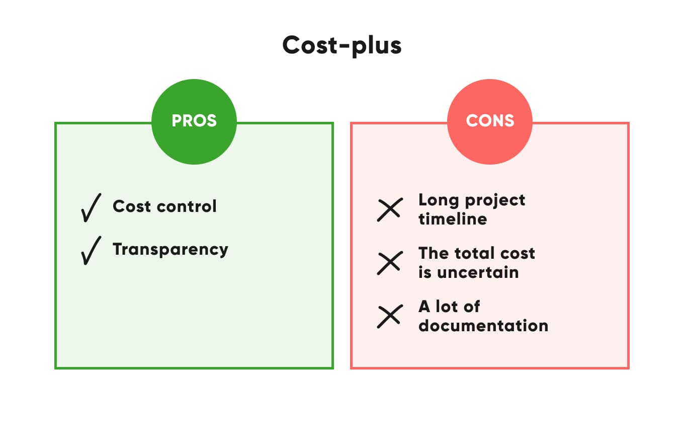 The cost-plus model presupposes fewer expenses than a fixed-price contract. With the fixed-price model, vendors often charge more to cover the risks of higher material costs. With cost-plus, you pay only for what is actually needed and used, nothing more.