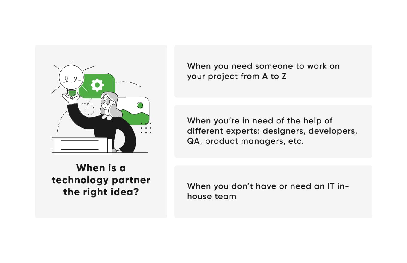 Do you need help with the entire project and help from an entire team of experts? Technology partnership is your best fit, then, especially if you are starting from scratch.