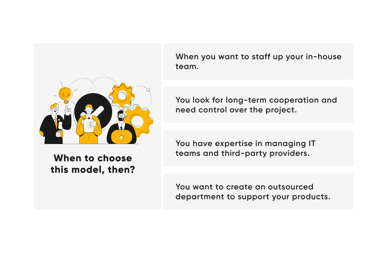 If you already have an IT in-house team who have proven their expertise and have successfully completed other projects, but you’re in need of some additional help, this model is for you.
