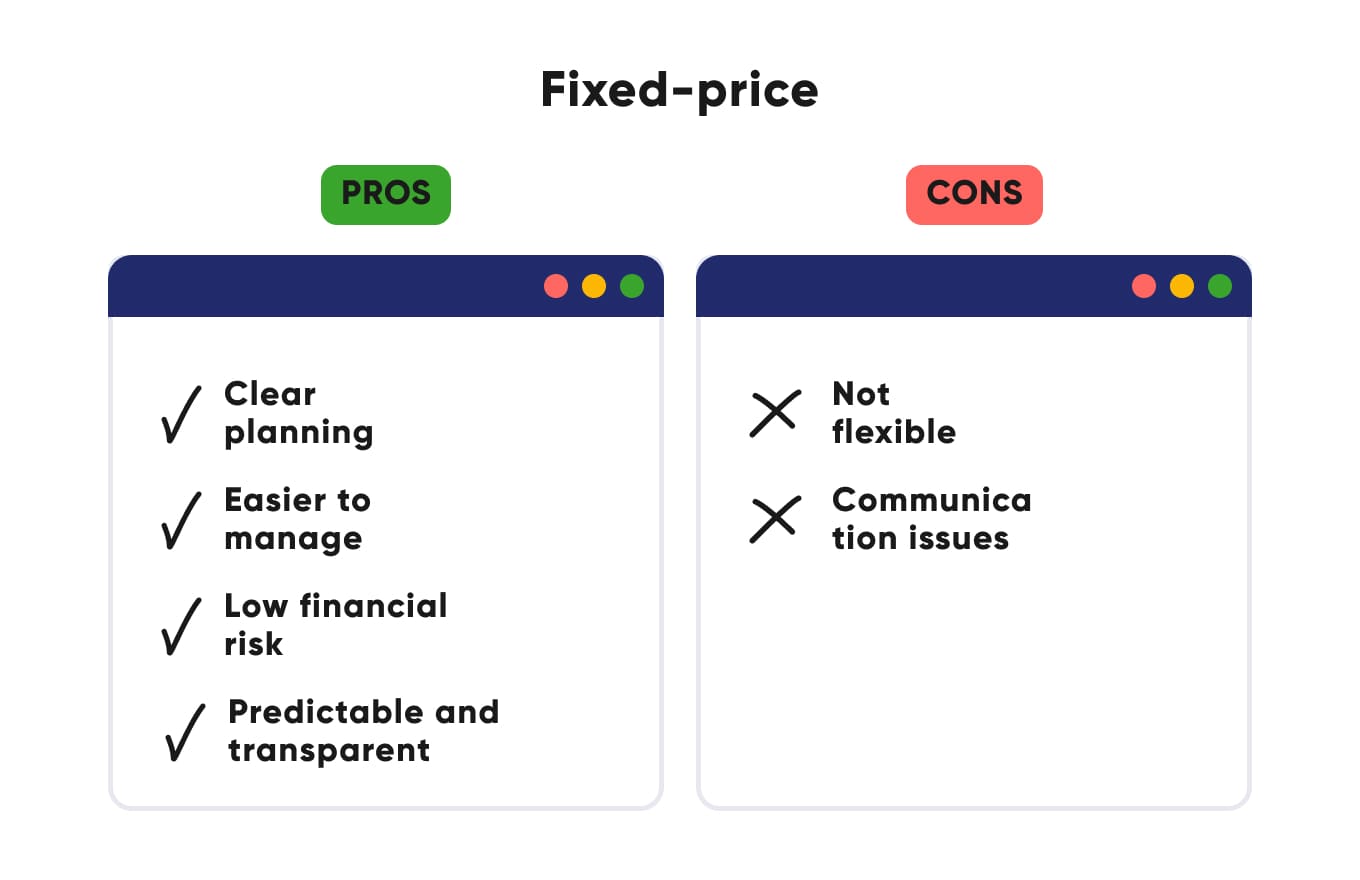 This pricing model presupposes thorough planning and strict terms and conditions of the agreement. Everything is defined in advance: time, task scope, budget, materials, etc. This way, the client pays a fixed price for the project, and the development team cannot charge extra for anything without the client’s approval.