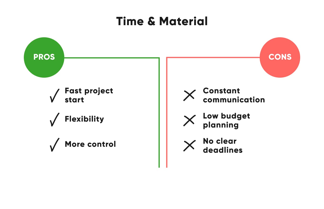 With this model, the prices aren’t fixed, and you can’t just pay a certain sum of money and forget about other expenses. With time & material, it is quite hard to predict the final cost of the development because of all the changes.