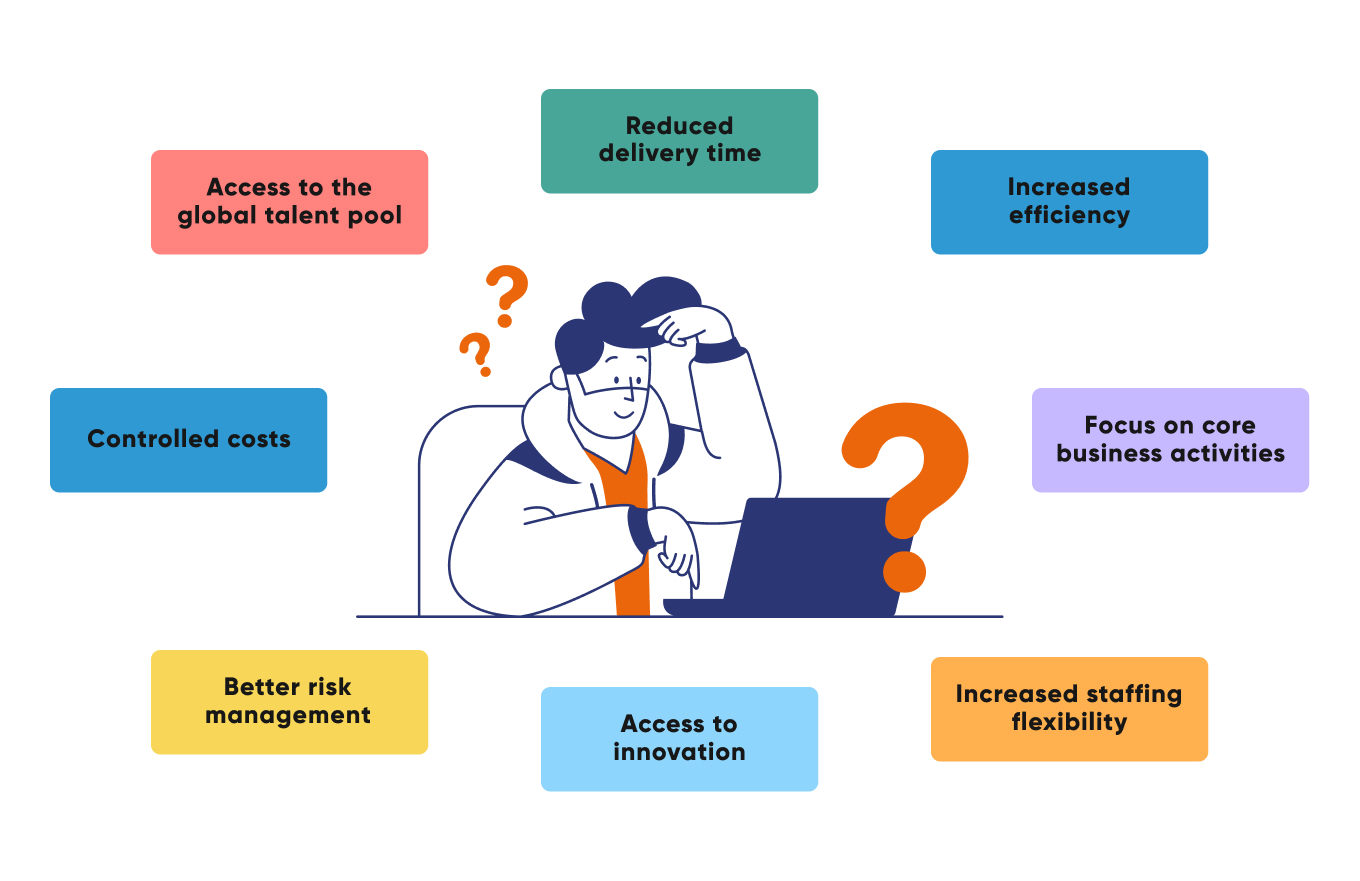 If you’re wondering whether to outsource or not, keep on reading. In this material, I’ll talk in detail about the outsourcing benefits for developers and focus on its possible risks and their mitigation.