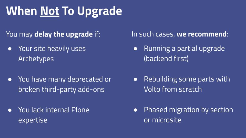 In such cases, we often recommend a partial upgrade of the backend first, rebuilding critical parts in Volto, or migrating in stages.