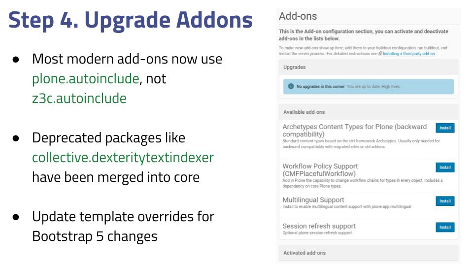 - Plone 6 removes portal_quickinstaller and temp_folder, so check compatibility