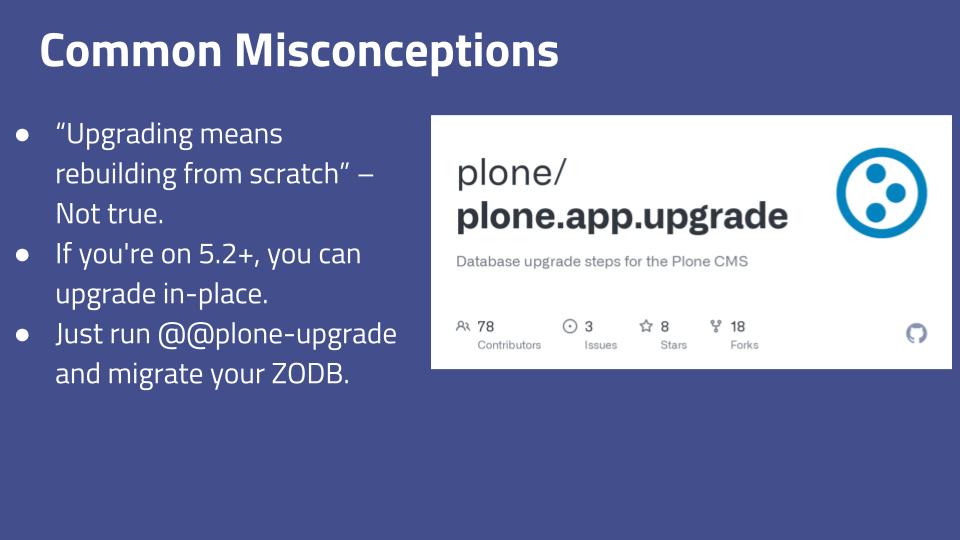The biggest misconception is that “upgrading to Plone 6 means starting from scratch.” This is not true.