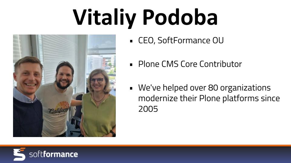 Hi, I’m Vitaliy Podoba, founder of SoftFormance and a core Plone contributor. My team and I have been working with Plone since 2005 — back when it was version 2 — and we’ve helped over 80 organizations modernize, migrate, and scale their Plone-based platforms.