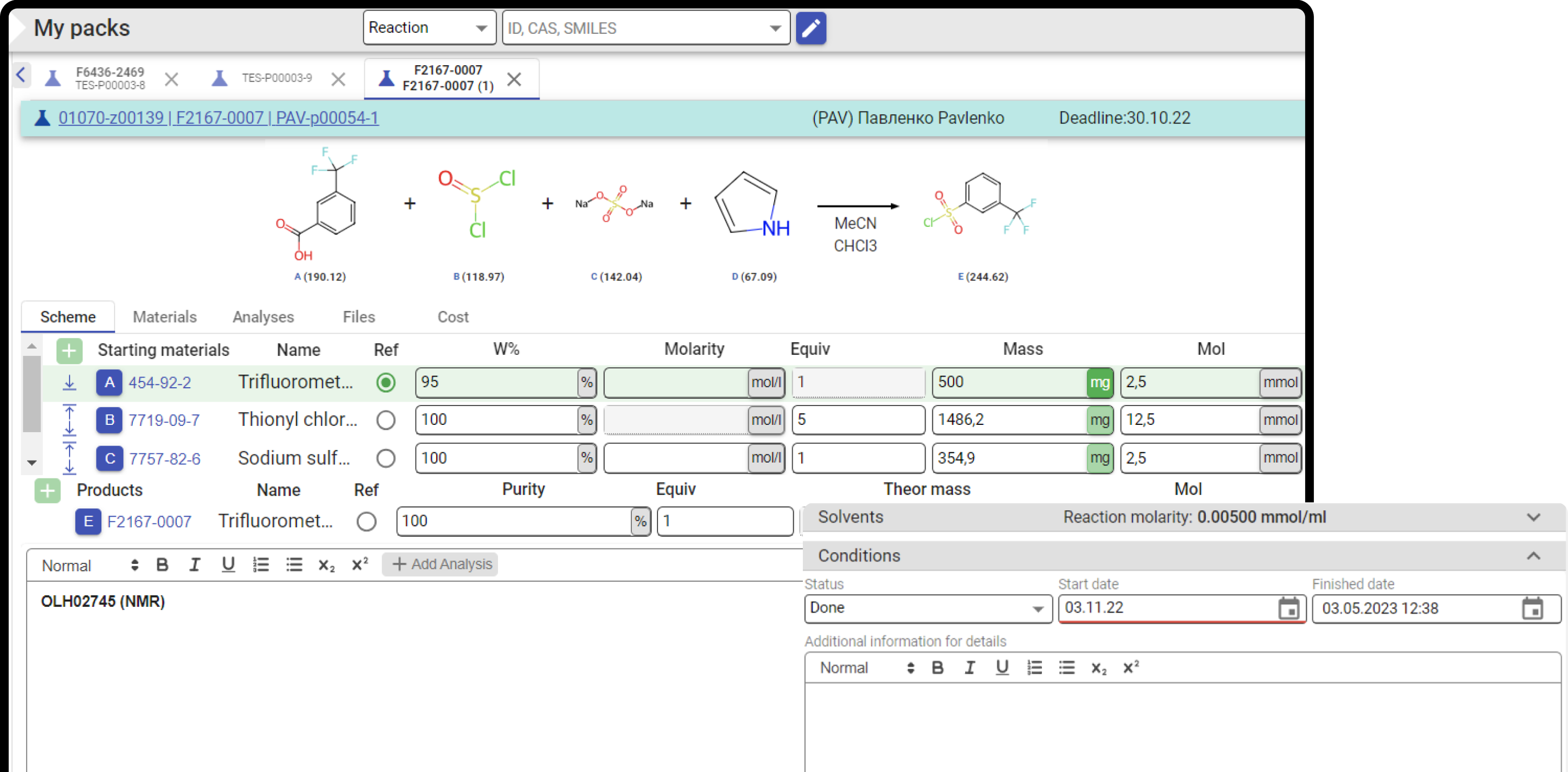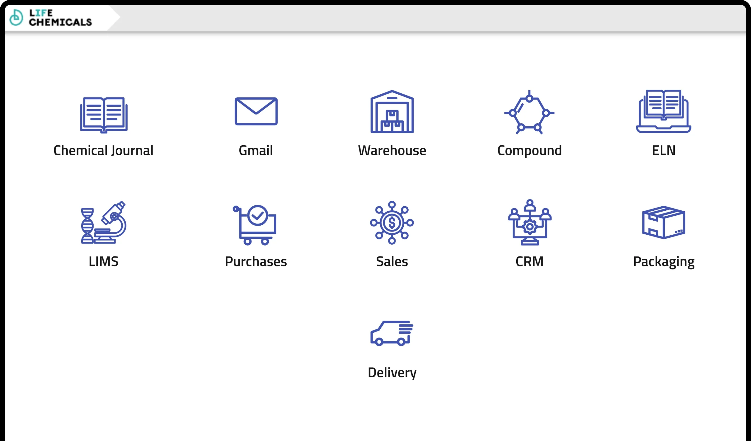 Our solution provides automation for customer’s processes across 8 departments, namely warehousing, inventory management, analytics, R&D lab management, custom synthesis lab management, packaging, purchases, and sales.