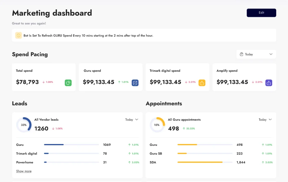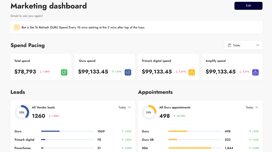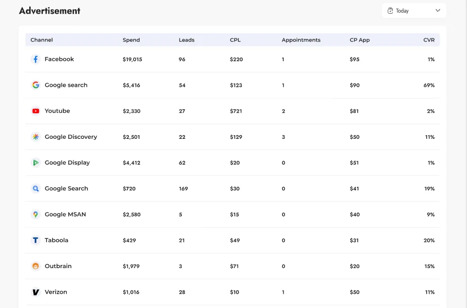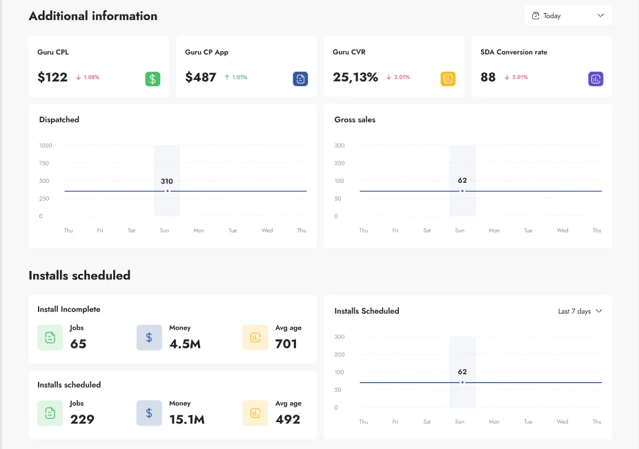 Analytical dashboard requirements made us not only suggest the best formulas and algorithms convert raw data from Ad Platforms and SalesForce but also suggest our client new marketing numbers that will benefit the end clients – Solar Panel agencies.